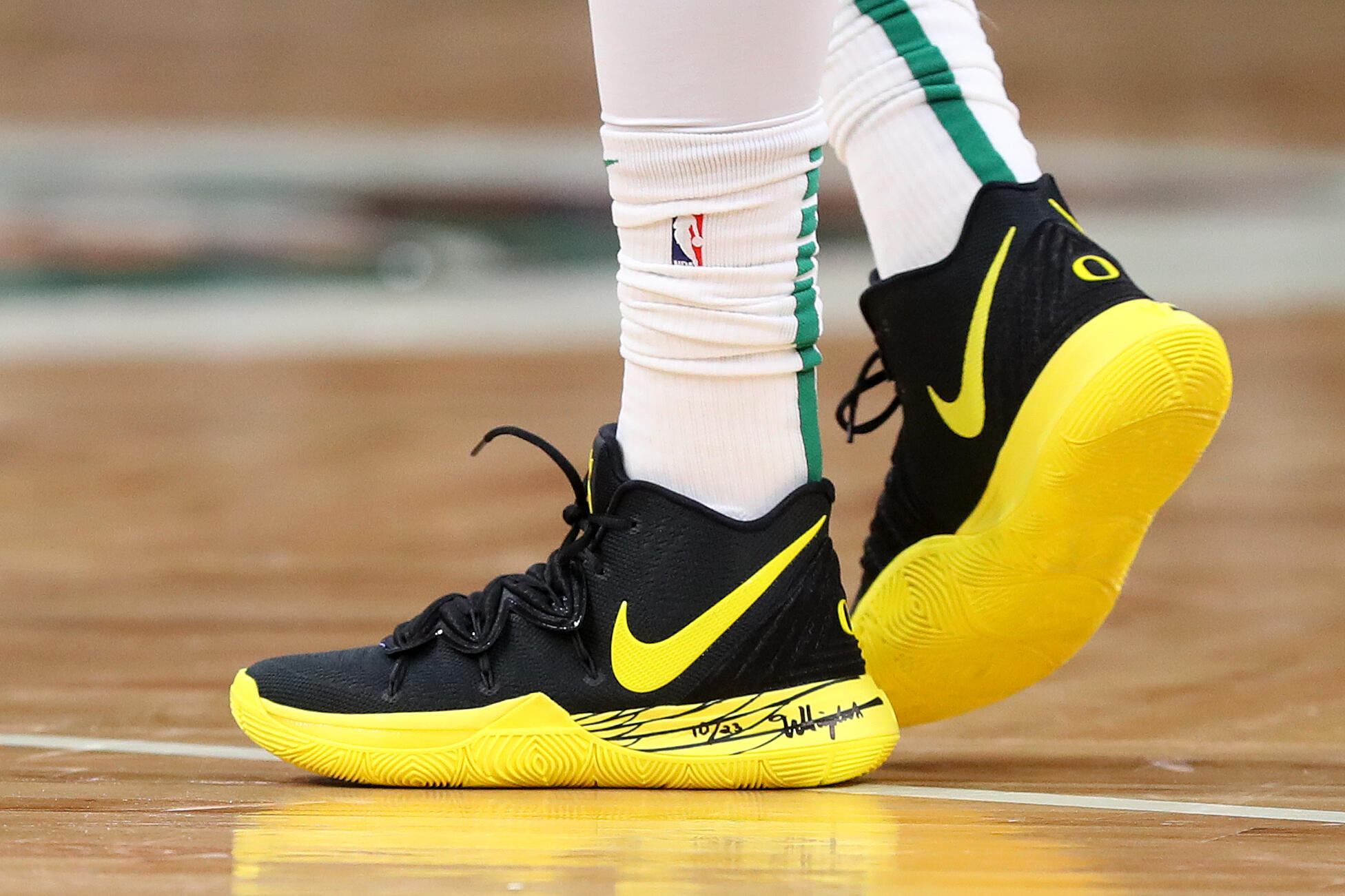 You debuted these last night on wnba players during a game—what made that the right venue to show these off for the first time? Kyrie irving #11 of the boston celtics looks on during the second quarter against the milwaukee bucks at td garden on october 18, 2017 in boston, massachusetts. Now, 20 years later, i get to share the love i have for the show, with a whole new generation of fans. The newest tv show to get the kyrie nod is spongebob, and starting of the collection is the kyrie 5 spongebob colorway. Detailed shots and the release date for entire nickelodeon collaboration. If nautical nonsense be something you wish, kyrie irving has a pair of shoes to sell you. However, some of the apparel is available now, but.